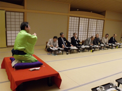 今回は「湖族亭新米(こぞくていしんまい)」さんこと、当クラブ会員のL津田に落語を一席お願いしました。 クラブ会員の中にはいろいろと趣味、特技をお持ちの方も多いですが、落語は珍しいですよね。前々からL津田の落語については噂をお聞きしておりましたが、ようやく拝聴する機会に恵まれました。 やはり緊張のためか、出だしは少しつまづきつつも、しばらくするとスムーズにお話が運び始め、身振り手振りも大きくなって、いよいよ落語家さんらしく(?)なってきました。なかなか堂々たる演じぶり。 ラストは上手に落としていただき、皆なぜかホッとしながら大笑いで幕となりました。いつかまたもう一度お聞かせいただきたいものです。 |